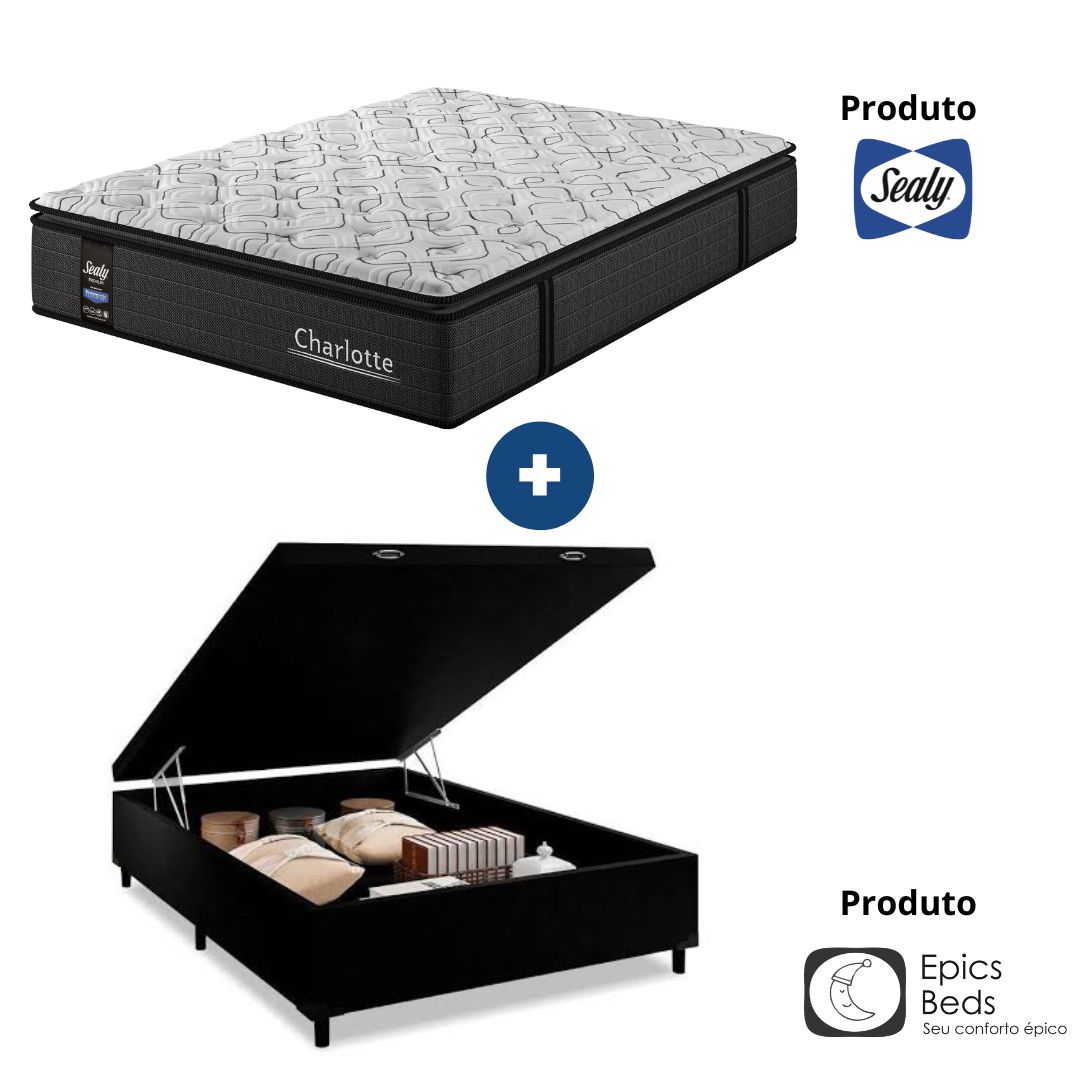 Conjunto Baú + Colchão Charlotte Sealy 34cm: conforto macio, suporte adaptativo e tecnologia avançada para um sono luxuoso e revigorante.